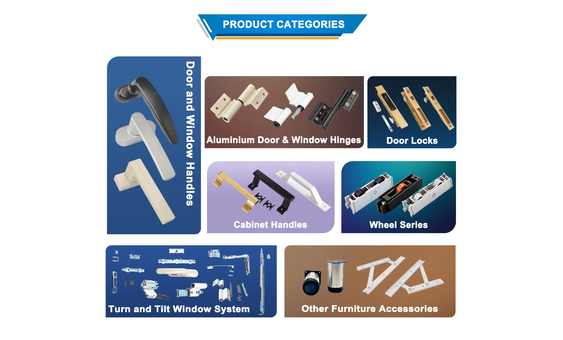 Productos principales:Manija de puerta y ventana de aluminio, Bisagra de puerta y ventana de aluminio, Cerraduras de puerta y ventana, Accesorios de aluminio, Sistema de puerta y ventana de aluminio